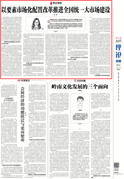 近日,暨南大学经济学院副院长、研究员、博士生导师钟韵在《南方日报》发表题为《以要素市场化配置改革推进全国统一大市场建设》的文章。