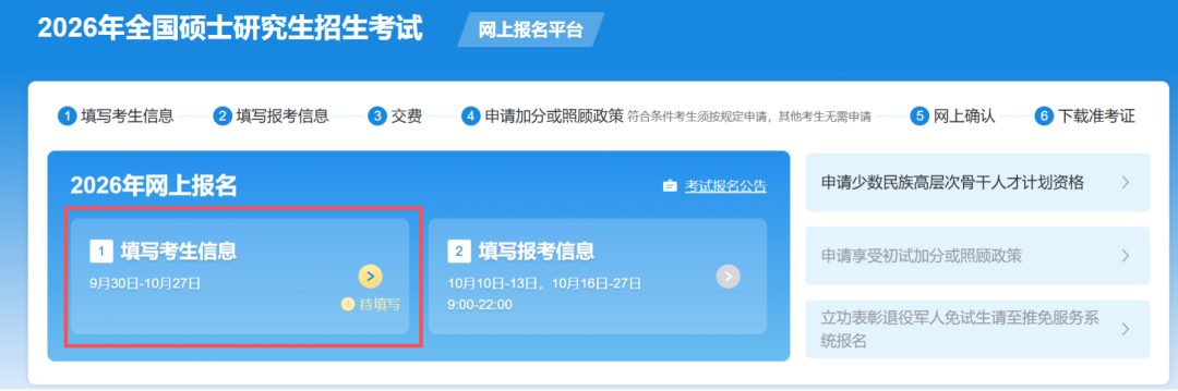 2026年研究生(统考)网上正式报名正式开启,根据往年经验,为避免出现意外情况,请各位考生尽早报名!