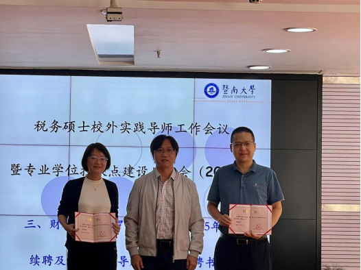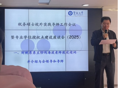 10月25日上午,暨南大学经济学院财税系税务硕士校外实践导师工作会议暨专业学位授权点建设座谈会在经济学院323室召开。税务硕士校外实践导师、经济学院学科建设与研究生培养办公室唐庆峰主任、校内导师以及2024级和2025级税务硕士学生参加了会议。