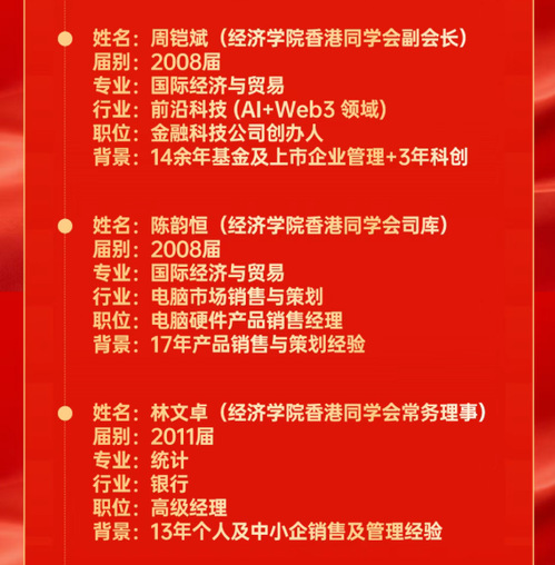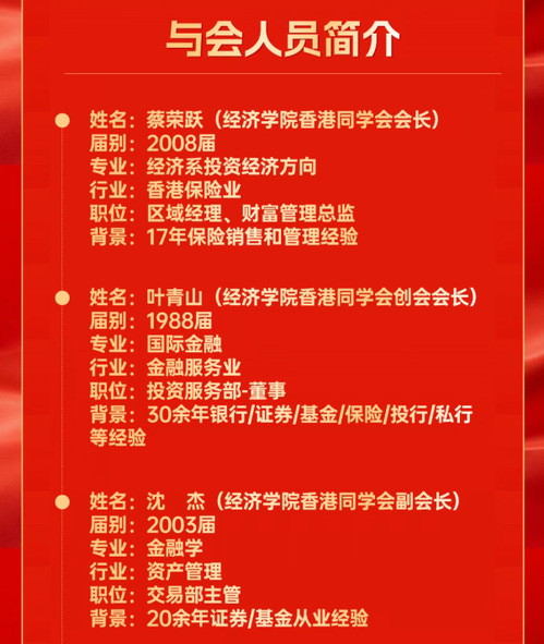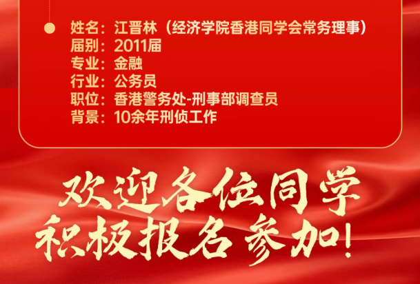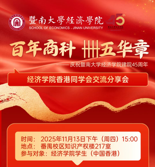 为庆祝经济学院建院45周年,加强学院与香港校友的紧密联系,推动学生就业向好,并促进香港同学会壮大,暨南大学经济学院香港同学会拟于2025年11月13日(周四)举行校友学生面对面交流会。