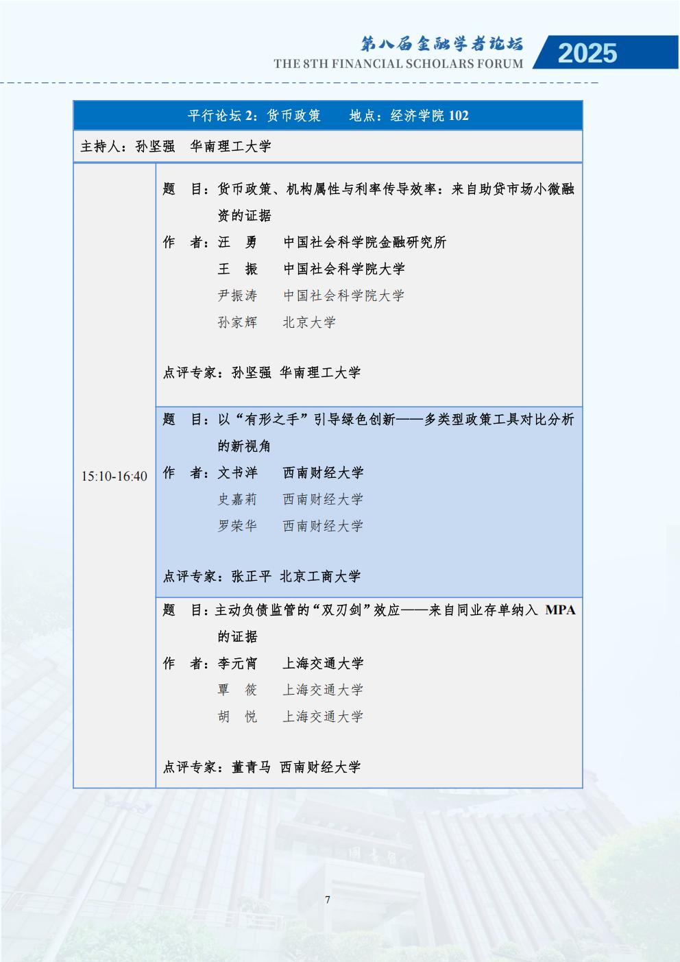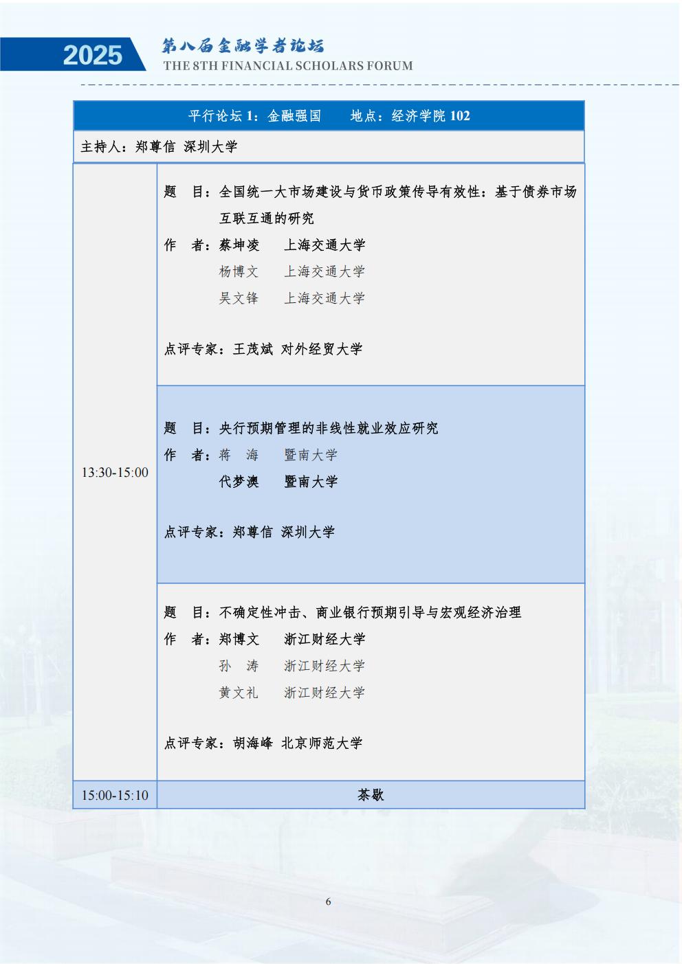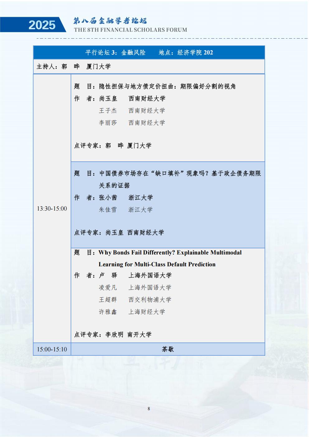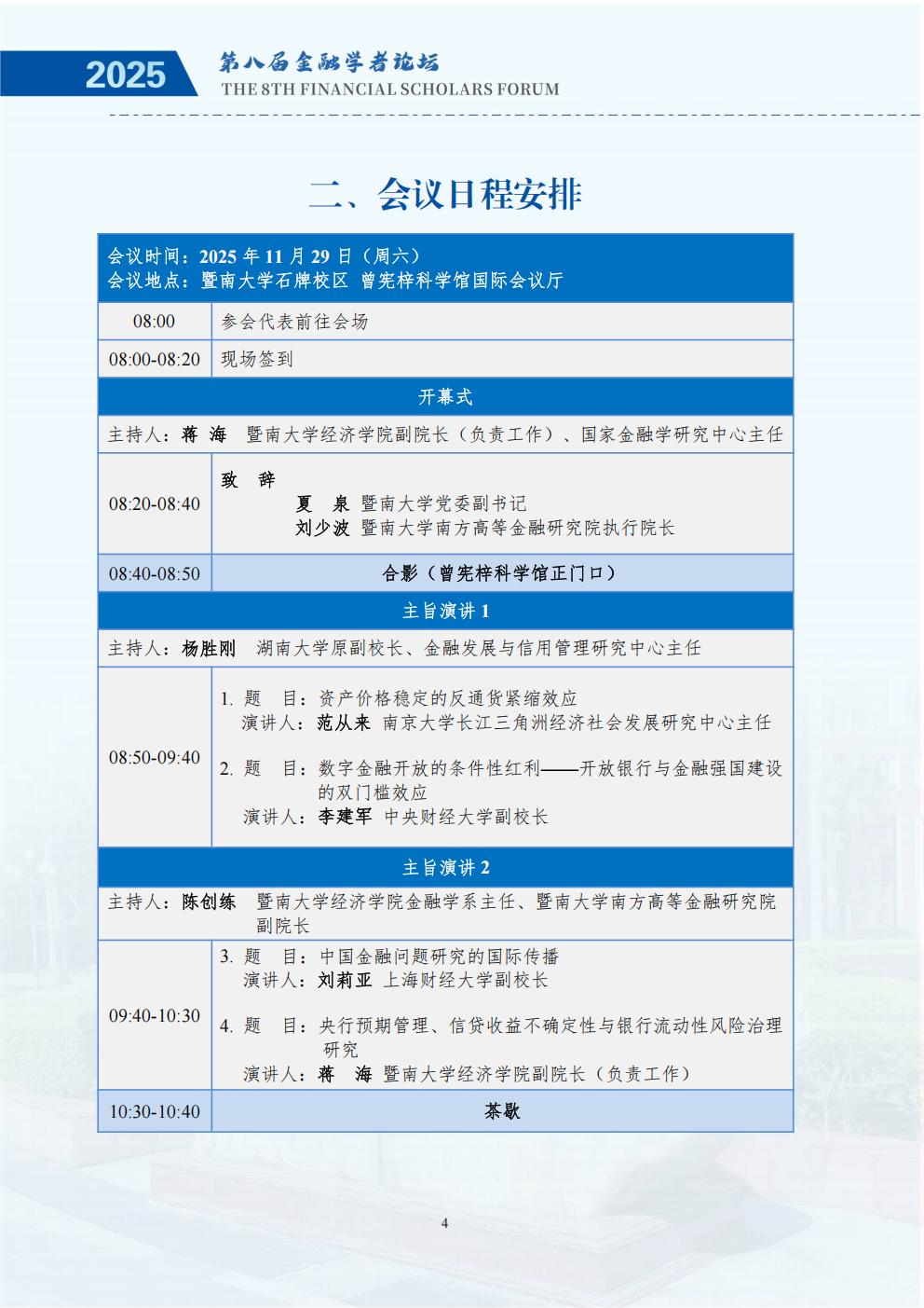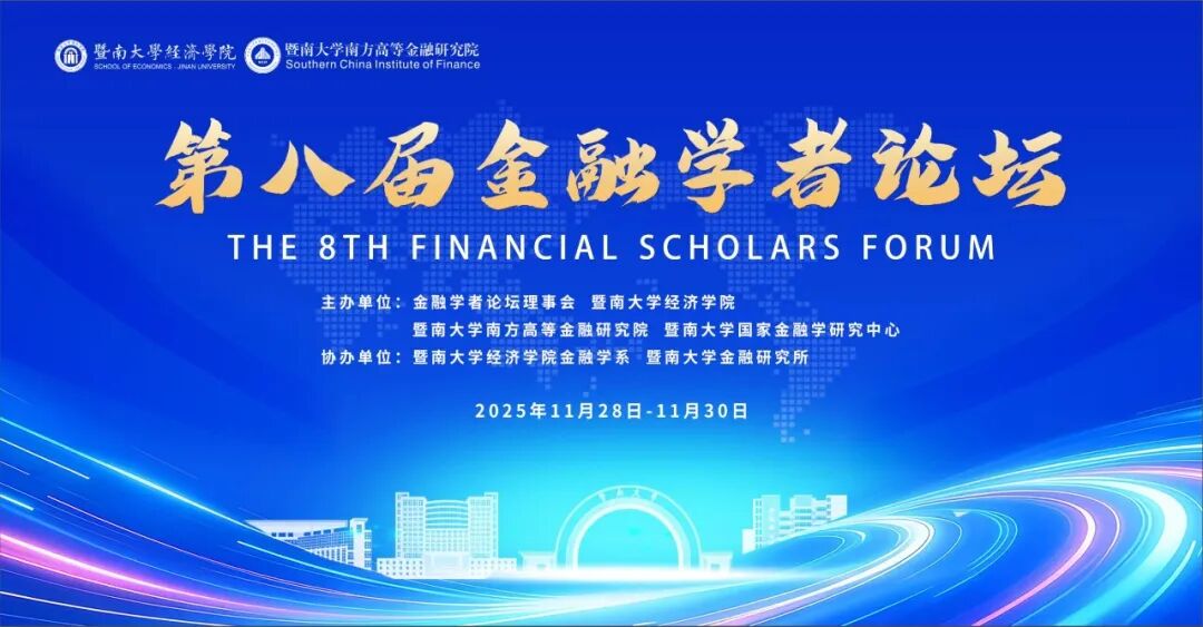 为深入研究金融强国战略与经济高质量发展的内在联系,推动学术界与实务界的深度交流,鼓励中国广大金融学者关注金融强国与经济高质量发展的理论与现实问题,推动基于扎实学术分析的政策研究,更好地服务国家重大战略需求,进一步助力金融高质量发展,经全体发起单位讨论决定,第八届中国金融学者论坛将于2025年11月28至30日在暨南大学举办,由金融学者论坛理事会、暨南大学经济学院、暨南大学南方高等金融研究院、暨南大学国家金融学研究中心主办。
