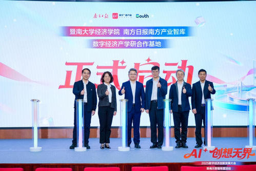 12月12日,以“AI+创想无界”为主题的2025数字经济创新发展大会在广州举办。本次大会由南方报业传媒集团(南方日报社)主办,暨南大学经济学院(以下简称经济学院)与南方产业智库联合承办,经济学院数字经济研究中心、广东省省情调查研究中心支持。会上,双方正式启动共建“数字经济产学研合作基地”,发布《广东数字产业创新发展报告》,旨在整合学界研究与产业实践,共同探索数字经济发展的前沿路径,为粤港澳大湾区乃至全国的数字化转型提供智力支持与创新动力。