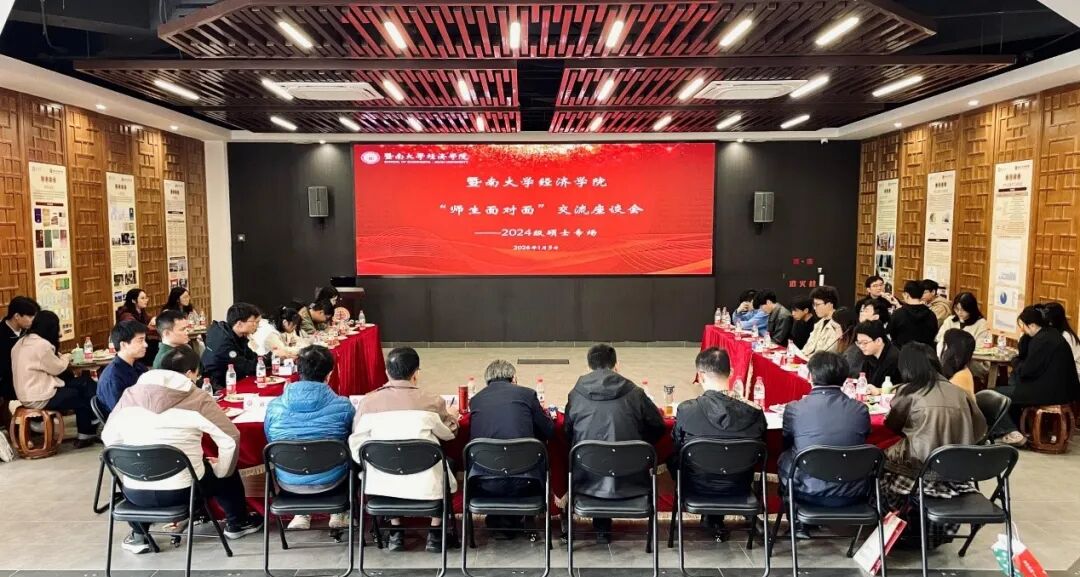 1月5日上午,经济学院“师生面对面”2024级硕士专场座谈会在广园东校区顺利举行,本次座谈会旨在进一步畅通师生交流渠道,了解2024级硕士研究生在学习、生活与求职方面的进展和困难,切实为同学们提供支持和帮助。学院党委副书记苏柯、学科建设与研究生培养办公室主任唐庆峰、金融学系党总支书记林伟雄、统计与数据科学系党总支书记伍业锋、国际经济与贸易系党总支书记余璐尧、财税系党总支书记罗勇辉、学院机关与特区港澳经济研究所联合党总支书记刘昂、学校心理中心老师卢普焜、全体研究生辅导员及30多位硕士研究生代表齐聚一堂,以真诚对话搭建连心桥梁,以务实交流共话成长发展。