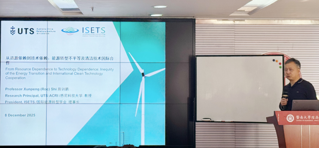 12月8日上午,暨南大学经济学院国际经济与贸易系百年华诞系列讲座第11期在暨南大学石牌校区经济学院大楼(中惠楼)323室举行。本次讲座邀请到了悉尼科技大学教授、国际能源转型学会理事长施训鹏教授作题为“从资源依赖到技术依赖:能源转型不平等及清洁技术国际合作”的主旨讲座,暨南大学国际经济与贸易系主任吴建新教授主持,国贸系师生参与。