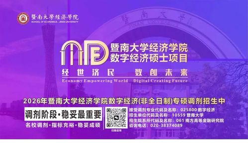 百年侨校底蕴,数智引领未来。暨南大学经济学院数字经济硕士项目,依托国家重点学科与前沿交叉课程体系,汇聚学界名家与业界精英,打造“数字赋能、产教融合”的全新培养模式。聚焦平台经济、产业数字化、数字金融及人工智能大数据分析四大前沿方向,扎根湾区、链接全球,助力您成为掌握数字经济理论、精通数字技术、具备全球视野的复合型优秀人才。